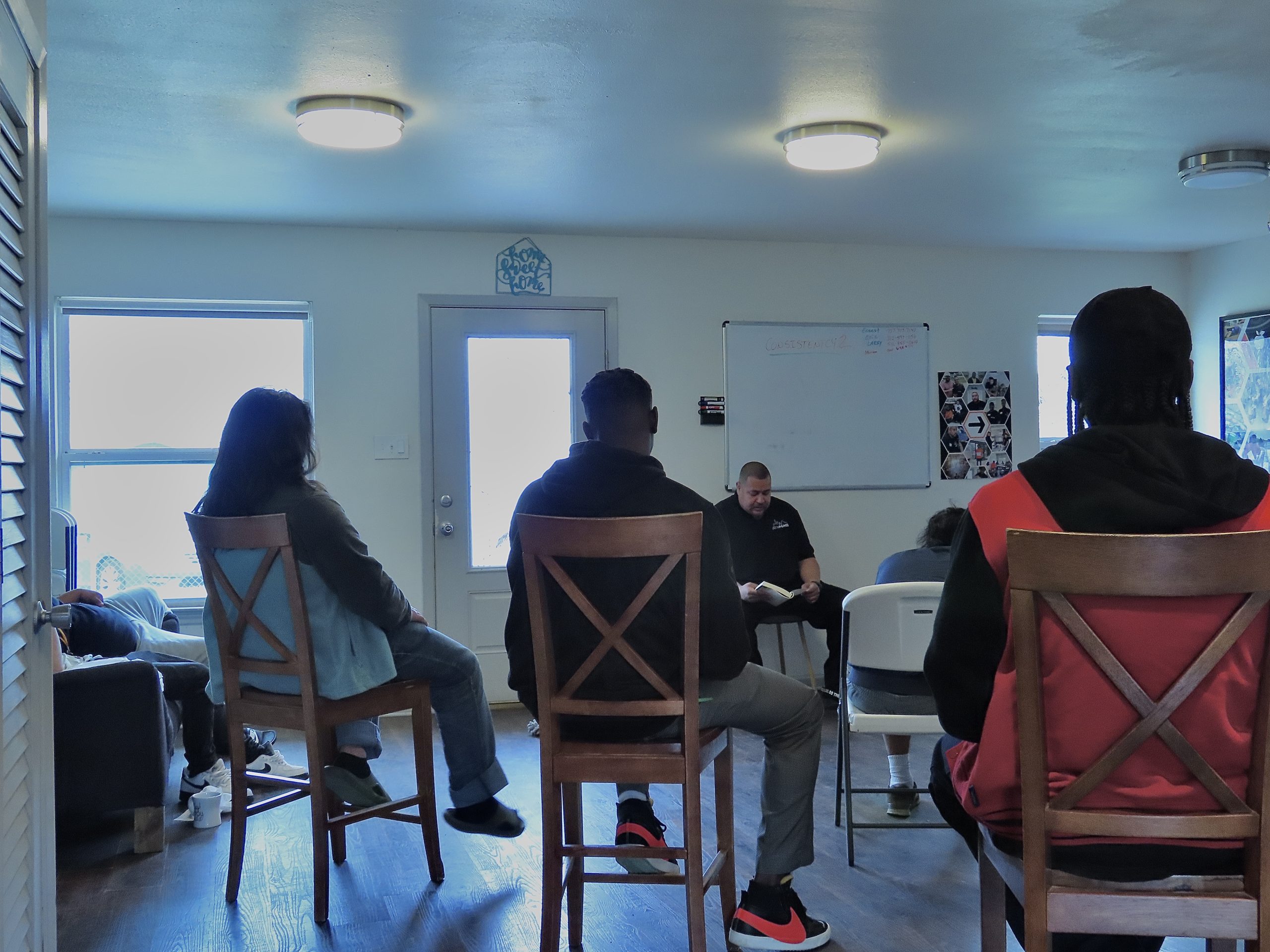 Abel Lopez leads a bible study at the Jail to Jobs safe house in Austin, Texas on Feb. 27, 2025. Abel is a formerly incarcerated person who know works as a violence interrupter and case manager for Jail to Jobs, and leads bible studies for participants every Wednesday. “This isn’t just a place to stay,” Abel shares. “It’s a place to heal, to grow, and to be seen.”