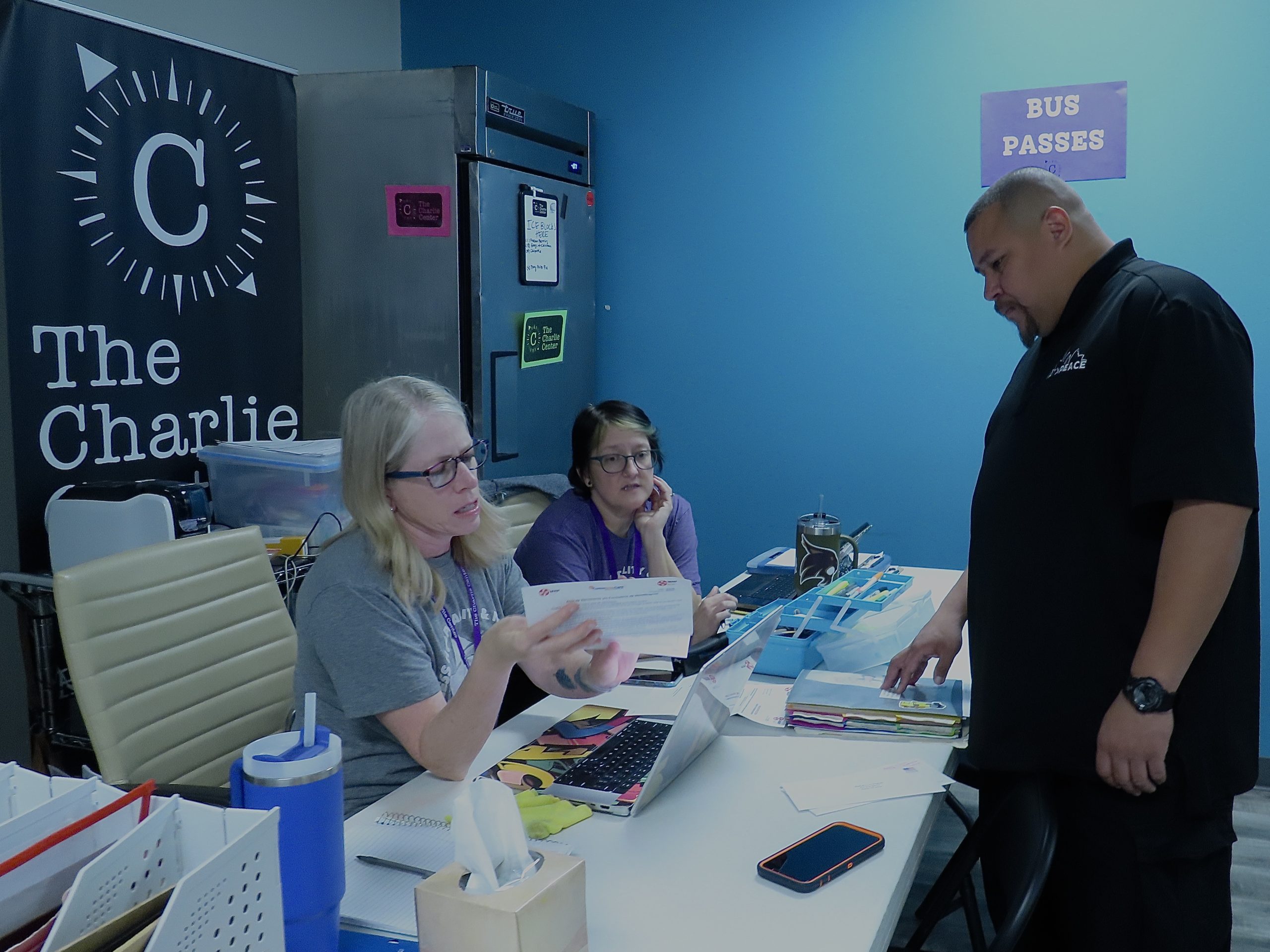 On Wednesday, Feb. 27, 2025, Abel Lopez discusses a Jail to Jobs participant’s bus pass with Leah Hargrave at the Charlie Center in Austin, Texas. Leah, who founded the Charlie Center just a few years ago, has built it into a crucial navigation hub for homeless individuals in the area, offering access to resources like transportation. “A bus pass might seem small, but it’s a key to freedom—it’s how they get to job interviews, housing appointments, and a better future,” Leah says, as she and Abel work together to support those in need.