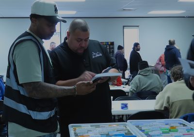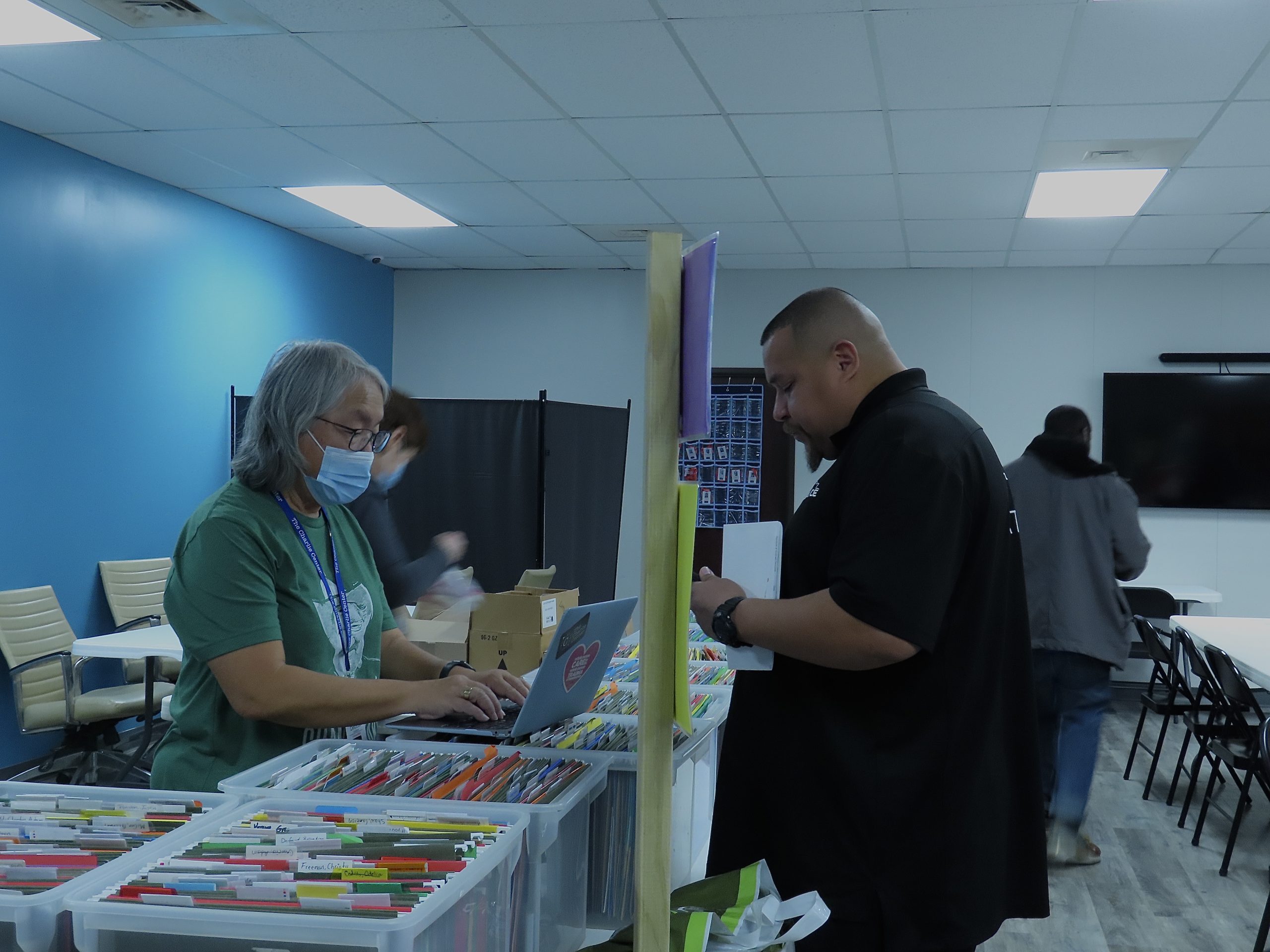 On Wednesday, Feb. 27, 2025, Abel Lopez and Brandon Henry discuss a Jail to Jobs participant’s important documents at the Charlie Center in Austin, Texas. Brandon, a formerly incarcerated individual who started as a participant in the Jail to Jobs program, now serves as a violence interrupter for the nonprofit.