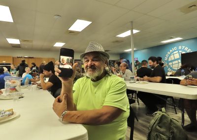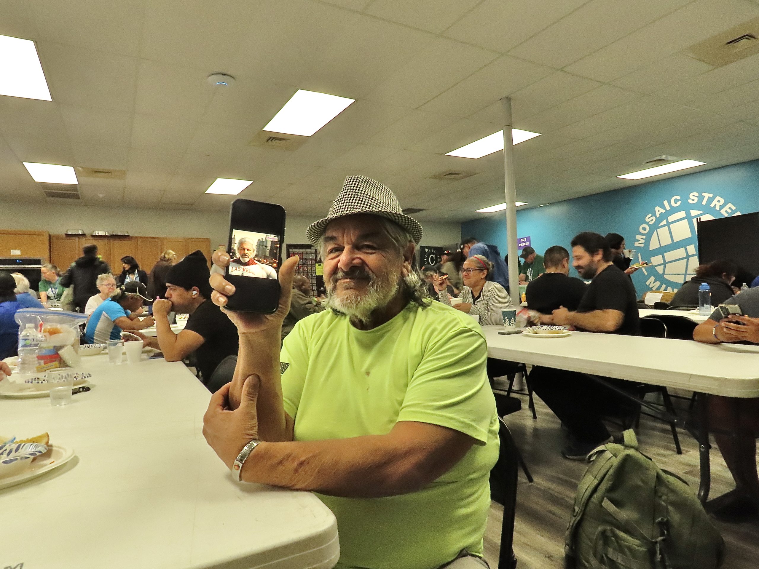On Wednesday, Feb. 5, 2025, Michael Cadenas, a homeless man from Eagle Lake, Texas, smiles as he shows me a photo on his phone after finishing his lunch. The image, created by his younger brother, portrays Michael as a proud and strong superhero—an uplifting depiction that contrasts with the struggles of his current reality. “He made this for me to remind me that I’m stronger than I feel sometimes,” Michael says, his voice filled with gratitude and pride.