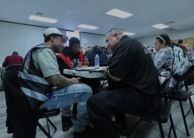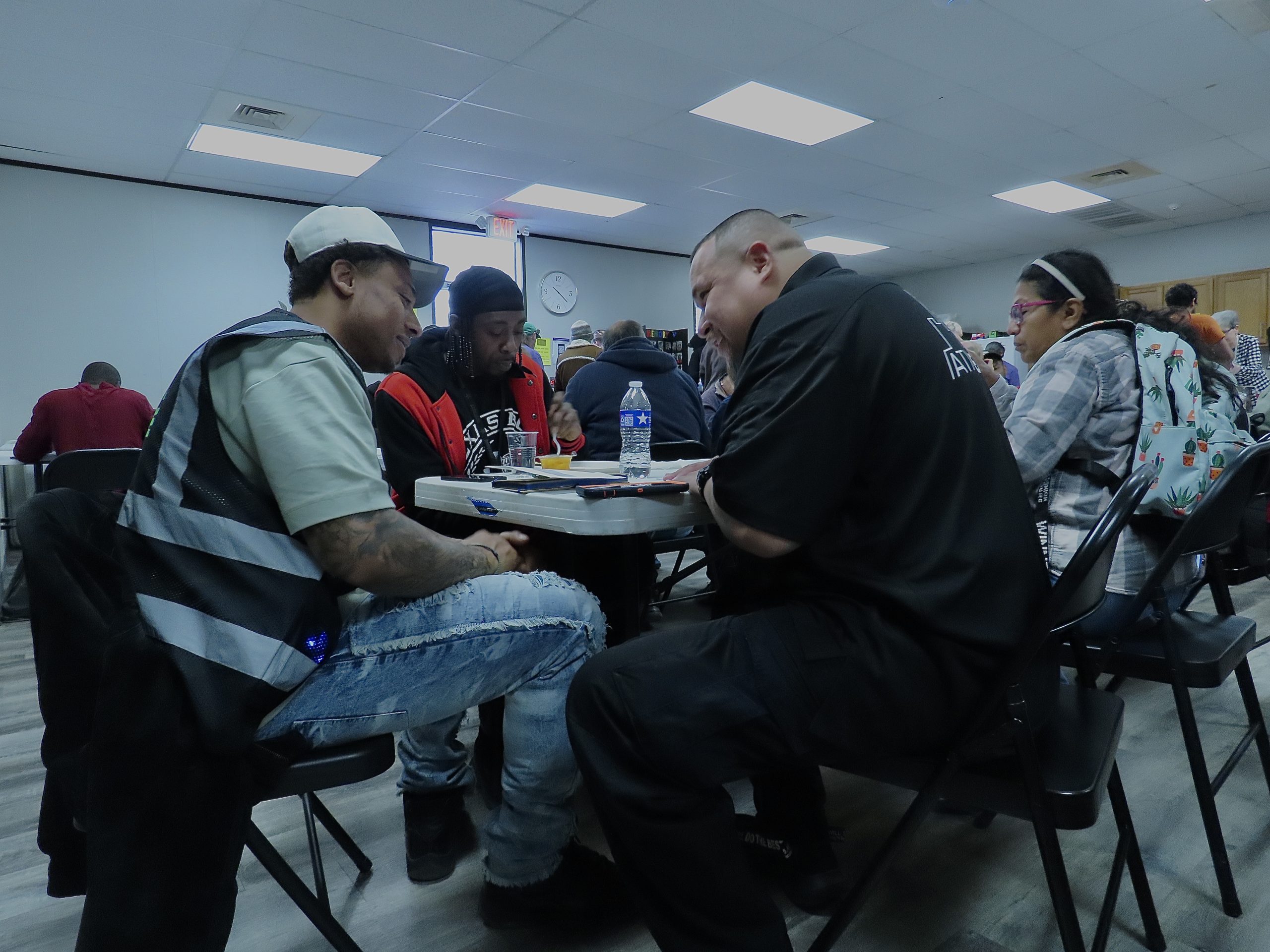 On Wednesday, Feb. 27, 2025, Abel Lopez and Brandon Henry sit down with a Jail to Jobs participant as he enjoys a meal provided by the Charlie Center in Austin, Texas. The conversation flows easily as they talk about the services that have become lifelines—housing, identification, and transportation—services Abel and Brandon regularly bring participants to access.