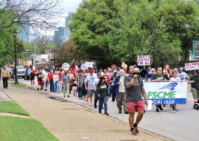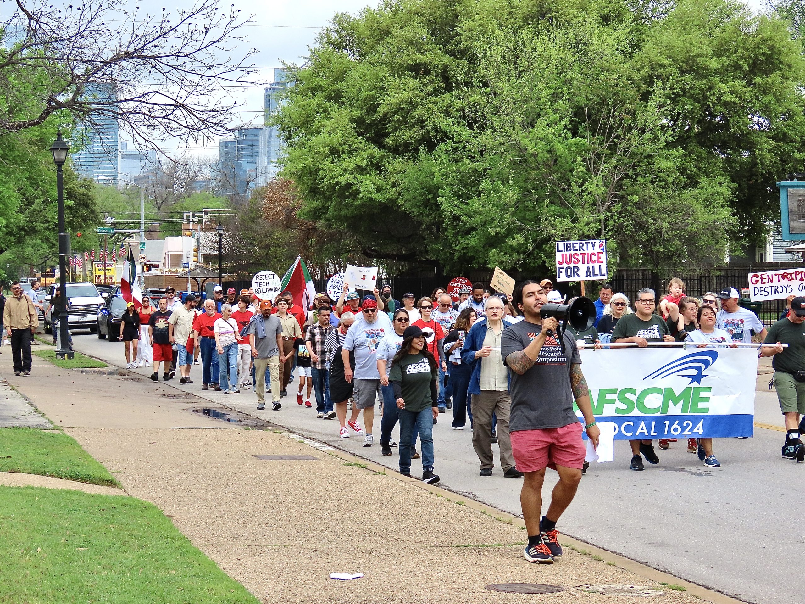 Marchers fill one lane of East 5th Street, carrying signs that speak of the protest, peace, and resilience embodied by Cesar Chavez, their steps echoing those who came before them. With the Austin skyline rising in the distance, the scene becomes a powerful bridge between past and present—honoring decades of struggle while pushing for continued change.