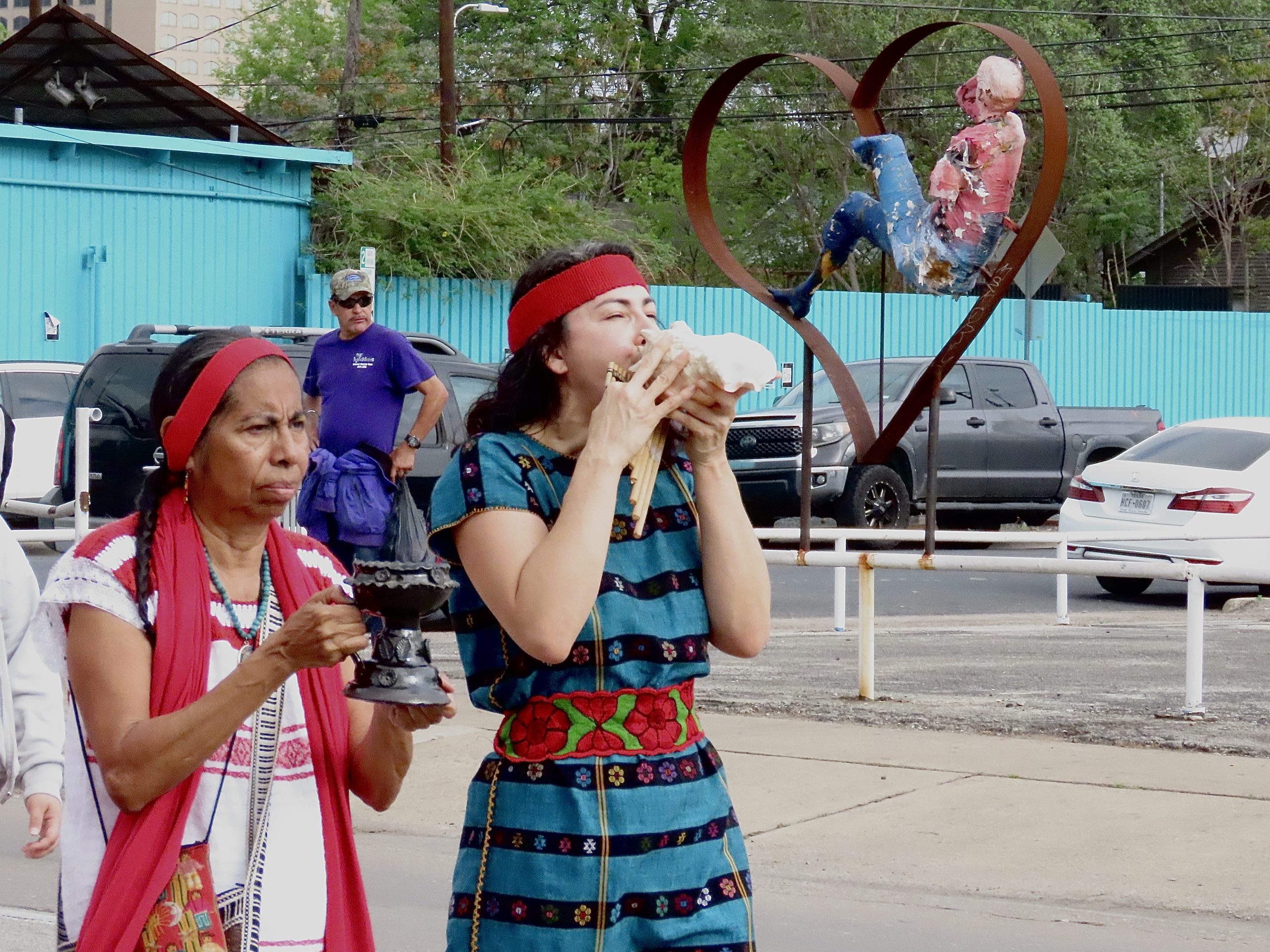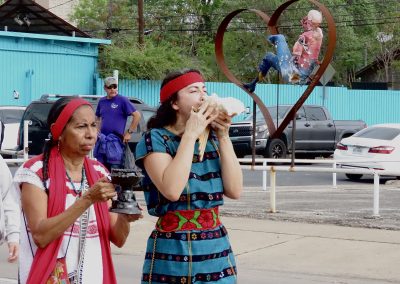At the front of the march, one leader raises a conch shell to her lips, its deep call echoing through the streets, while another gently waves sacred incense through the air—together guiding the crowd into a ritual rooted in honor, resistance, and cultural legacy. Their ceremonial entrance pays tribute to the life and impact of César Chávez.