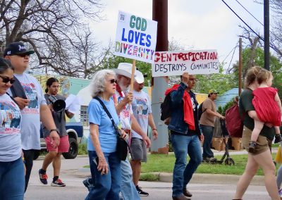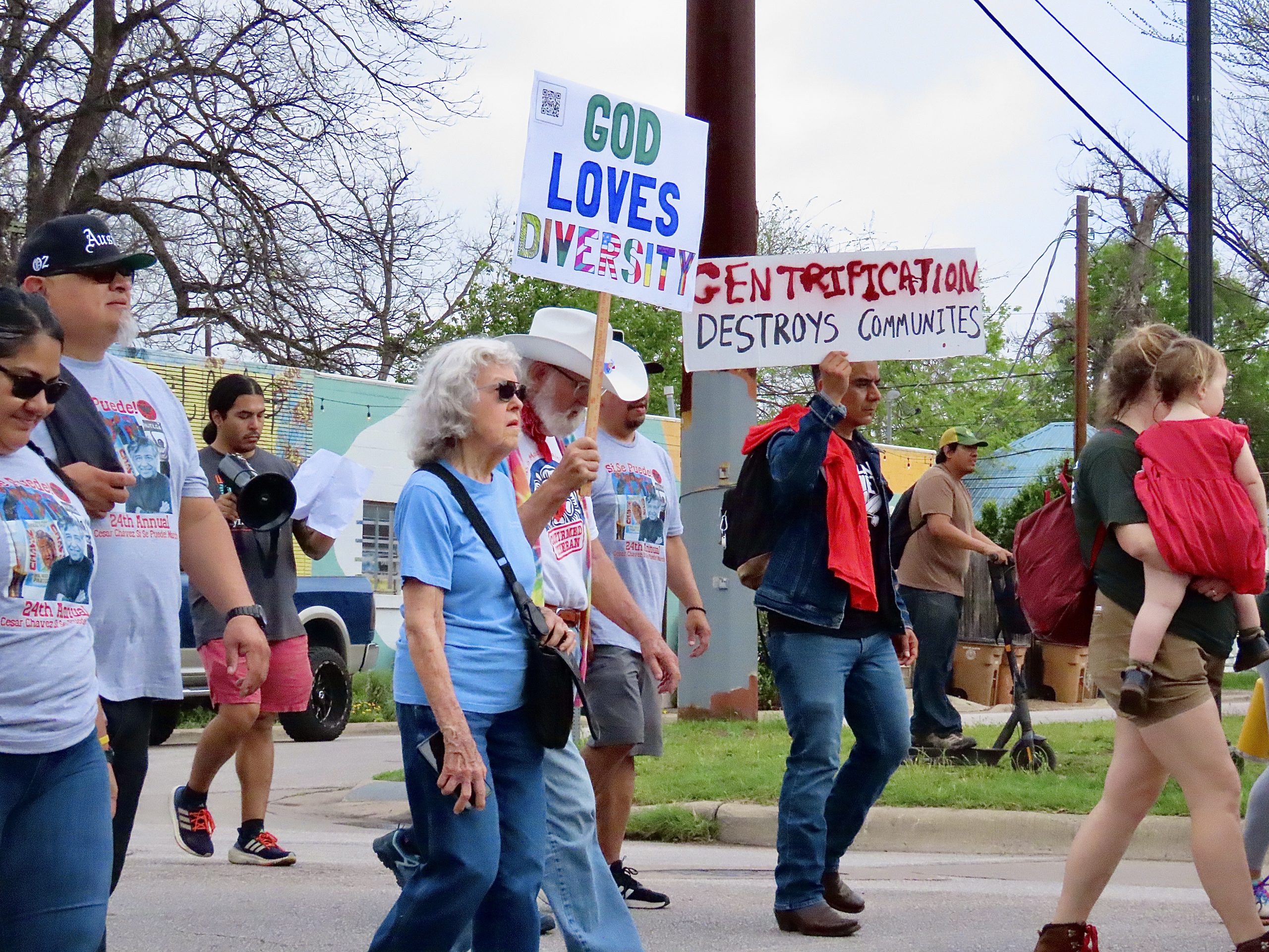 William Hershel, a longtime Austin resident, holds a sign calling for unity and diversity as he and his wife walk side by side with fellow demonstrators down 5th Street during the annual César Chávez March. The Hershels have been part of the march for over a decade, standing in solidarity with the movement’s message of justice and inclusion. “We show up every year because this is about more than history—it’s about continuing the fight for equity in our own backyard,” William says.